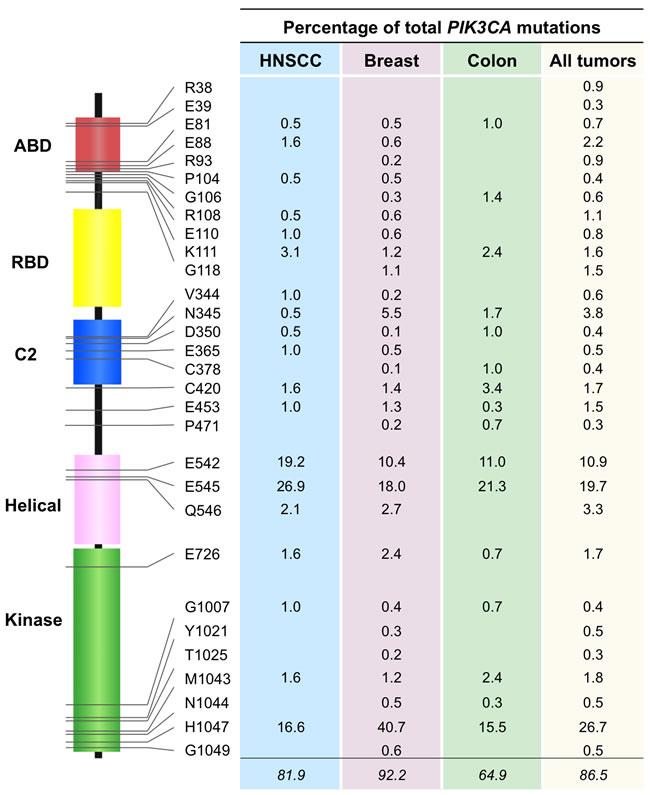 In HNSCC, PIK3CA mutations tend to be heavily focused on the helicase (exon 9) and kinase (exon 20) domains [25-27], which also holds true for PIK3CA mutations in most sporadic cancers (Figure 1). In the past few years, genomic datasets of HNSCCs have expanded with efforts led by The Cancer Genome Atlas (TCGA) [28, 29]. In Figure 1, the PIK3CA point mutation frequencies of HNSCC, breast cancer, and colorectal cancers catalogued by the TCGA are compared. The frequencies of PIK3CA mutations were 17.5%, 36.4%, and 16.7% in HNSCC, breast, and colorectal cancer, respectively. Of note, the hot-spot mutations on exon 9 (corresponding to residues E542 and E545 in p110α) and exon 20 (residue H1047) are the most common alterations regardless of cancer type. E542 and E545 are frequently mutated to lysine and H1047 is frequently altered to arginine.