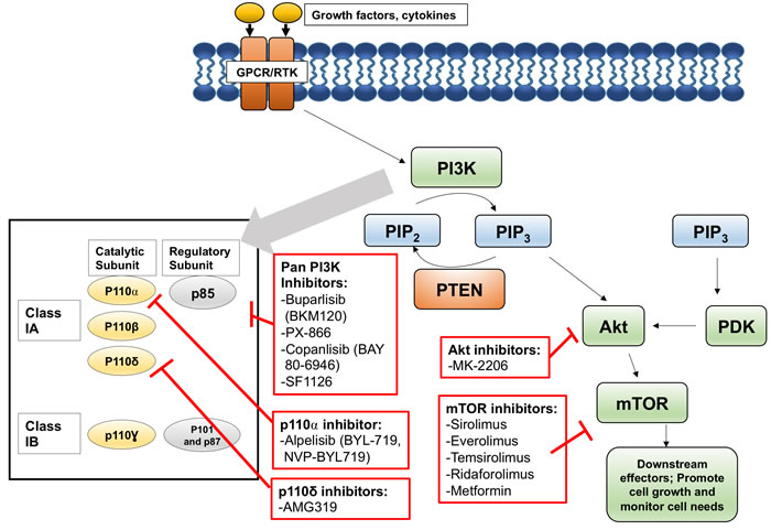 Key players of the PI3K pathway include receptor tyrosine kinases (RTKs) such as epidermal growth factor receptor (EGFR), G-protein coupled receptors (GPCRs), PI3Ks, phosphatidylinositol 4,5-bisphosphate (PIP2), phosphatidylinositol (3,4,5)-trisphosphate (PIP3), Akt, mTOR, and PTEN. RTKs and GPCRs bind growth factors and cytokines at the cell surface, and then transduce signals via a number of intracellular pathways, such as the PI3K pathway. PI3Ks are classified into three groups: classes I, II, and III. Class I is subdivided into class IA and class IB and they consist of a catalytic (p110) and regulatory (p85 for class IA and p101 and p87 for class IB) components. Class IA is activated by various types of cell surface receptors and has 3 isoforms, p110α, p110β, and p110δ. Class IB is activated primarily by G-protein coupled receptors and has one isoform, p110γ. Of these isoforms, class IA PI3Ks have been studied the most extensively. Binding of p85 to p110 stabilizes p110, inhibits their kinase activity, and recruits phosphotyrosine in activated receptors or adaptors. The engagement of p85 and phosphotyrosine activates the kinase activity of p110 by releasing the p85-mediated inhibition of p110 [6]. The activated catalytic subunit of PI3K (p110) phosphorylates PIP2, generating PIP3. PIP3 binds Akt (protein kinase B), a serine/threonine protein kinase, leading to the exposure of two amino acid residues requiring phosphorylation. PIP3 also binds phosphoinositide-dependent protein kinase-1 (PDK1), which phosphorylates those two residues, leading to the full activation of Akt. Activated Akt then phosphorylates other proteins and thus affects a number of cellular processes. mTOR, another serine threonine protein kinase, is activated by Akt and plays an important role in cell growth by monitoring cellular needs, such as nutrients, oxygen, and energy. mTOR forms two distinct complexes with other proteins and both complexes are involved in tumorigenesis [7, 8]. Akt activates mTORC1 indirectly by inactivating proline-rich Akt substrate 40 kDa (PRAS40) and tuberous sclerosis complex (TSC2), which inhibit mTORC1. mTORC1 then regulates protein translation, specifically by targeting ribosomal protein S6 (pS6) kinase and eukaryote initiation factor 4E-binding protein 1 (4E-BP1). mTOR complex 2 (mTORC2) is involved in activation of Akt by phosphorylation of Ser473 in Akt. The mechanism of mTORC2 activation is not clear. Lastly, PTEN (phosphatase and tensin homology deleted from chromosome 10) is an important negative regulator of this pathway, as it serves to dephosphorylate PIP3 to PIP2 [9, 10].