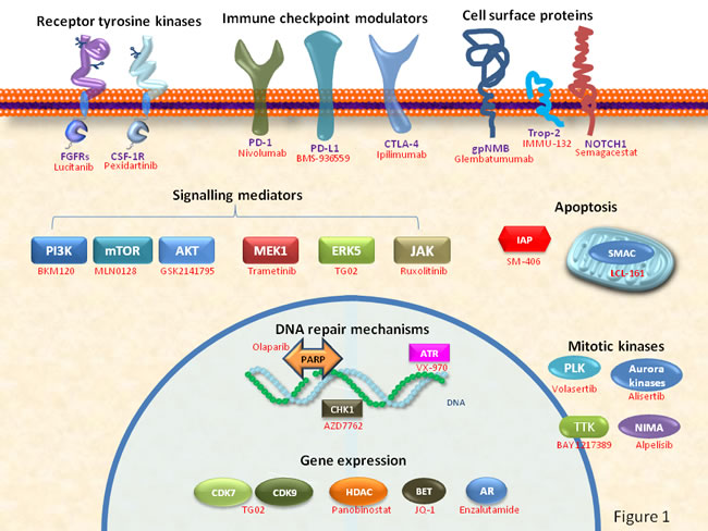 Figure 1: Schematic representation of cellular functions and key components used as potential drug targets for the therapy of TNBC. Examples of drugs already approved or under clinical development are shown in red.