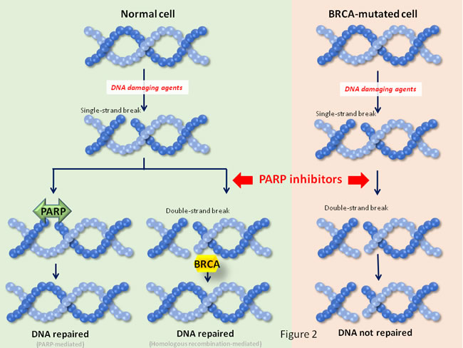 Figure 2: Synthetic lethality interactions for PARP inhibitors. In synthetic lethality two different pathways participate to sustain a cellular function. In the case shown in the figure, single strand DNA repair is accomplished by the action of PARP. In case the lesion progresses to a double strand break, it can be repaired by the action of BRCA1. In case one of the pathways is impaired (e. gr. by loss of function of BRCA1), the cellular function is still supported by the action of the other pathway. An alteration in a base, or a single strand break is usually repaired by the base excision repair mechanism, in which PARP proteins play an essential role. If inhibitors of PARP are used, then the single strand alteration may evolve to double strand breaks. The repair of lesions depends on the integrity of BRCA proteins. In patients whose tumors are defective in BRCA activity, the PARP inhibitors create DNA double strand breaks that are not repaired, leading to cell death.