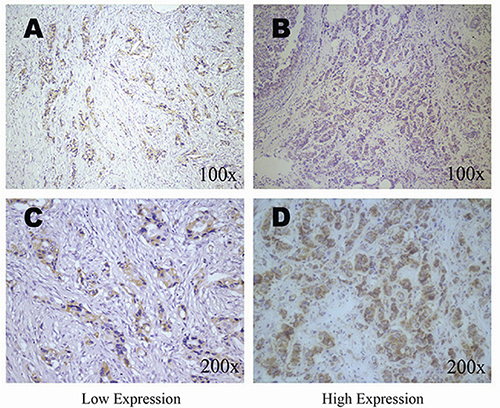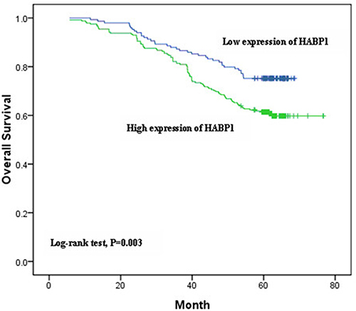 The immunohistochemical staining of HABP1 were scored by combining the proportion and intensity of positively stained tumor cells. The staining intensity was classified as 0 (no staining), 1 (weak staining), 2 (moderate staining), and 3 (strong staining). The percentage of positive cells was classified as 0 (no positive tumor cells), 1 (≤ 10% positive tumor cells), 2 (10–50% positive tumor cells), and 3 (≥ 50% positive tumor cells). Staining index (SI) was calculated as a proportion score × staining intensity score. The final scores ≤ 4 were considered to be low expression, and the remainder were classified as high expression. Cases with discrepancies were re-reviewed simultaneously by the original two pathologists (NXM and SHT) and a senior pathologist (LXM) until a consensus was reached.