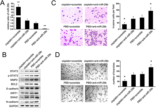 Figure 5: miR-29b/STAT3 axis was involved in the chemotherapy of cisplatin. (A) The expression of miR-29b in cervical cancer cells transfected with anti-miR-29b or scramble mimic after treated with cisplatin or PBS; (B) Western blot assays were performed to explored the expression of STAT3, p-STAT3, MMP2, BCL2, E-cadherin, KIRT1, SNAI2 and N-cadherin in cervical cells showed in A; (C) Matrigel invasion assays were performed to explore the effects of miR-29b on the invasion of CC cells showed in A; (D) vasculogenic mimicry (VM) assays were performed to explored the effects of miR-29b on the angiogenesis of CC cells showed in A. The data are representative of three independent experiments. Error bars represent s.e.m. *P < 0.05; **P < 0.01.