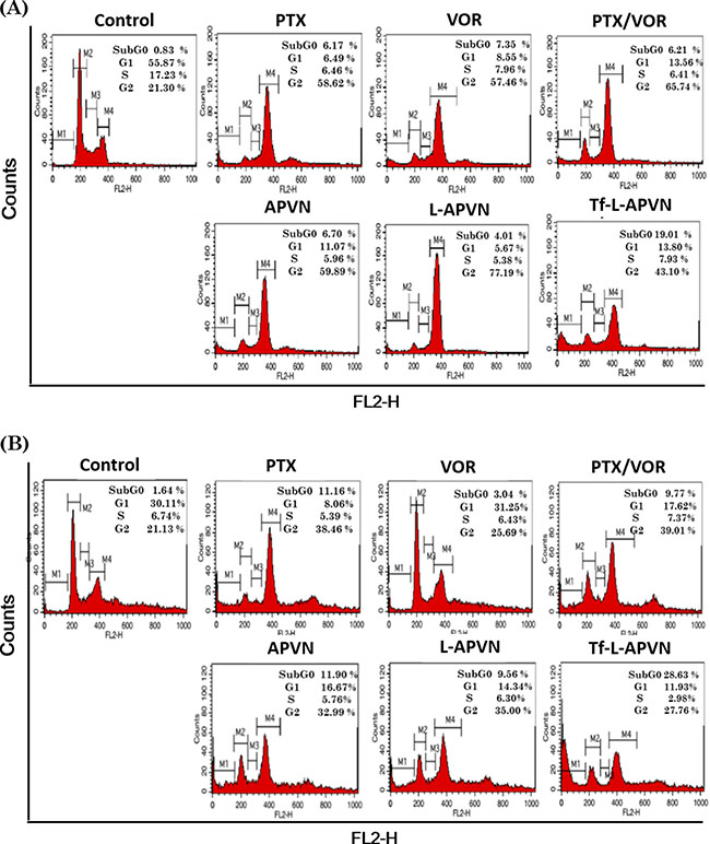 Cell cycle distribution patterns were investigated to evaluate the intracellular effects preceding the cytotoxic effect of various formulations (Figure 5). As expected, combination of PTX and VOR remarkably increased the proportion of cells in G2/M phase of cell cycle in MCF-7 and HepG 2 cancer cells. A significant increase in percentage of apoptotic cells (measured as sub-G0 content) could be detected in cell populations (~ 19–25%) treated with Tf-L-APVN, compared to other groups.