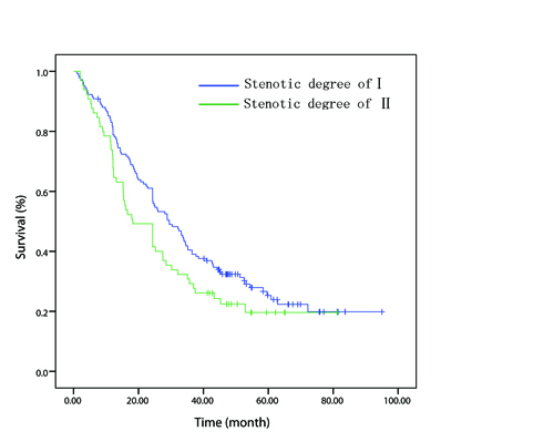 To our knowledge, the present study is the first study to evaluate the value of preoperative measurement of esophageal luminal stenosis in predicting OS in patients with ESCC. Our results validated the prognostic value of endoscopic tumor stenosis and suggested tumor with stenotic degree of II may imply a poor OS in patients with ESCC as compared to degree-I tumor. Several limitations to this study should be mentioned, such as its retrospective nature. The upper GI endoscopy was not performed by a single specialist. Therefore, inter-observer bias may exist. Furthermore, ESCC patients with advanced disease or distant metastasis were not surgical candidates and were not enrolled in the study. Therefore, our results may not be applied comfortably to all patients with ESCC.