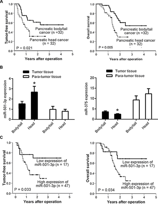 Figure 1: Low expression of miR-501-3p in pancreatic body/tail cancer, contributing to a low risk of tumor recurrence. (A) Kaplan-Meier curves, showing both tumor-free survival and patient overall survival, which were higher in the patients with pancreatic body/tail cancer than in those with pancreatic head cancer; (B) Bars representing the significantly lower expression of miR-501-3p and higher expression of miR-375 in pancreatic body/tail cancer compared with pancreatic head cancer, as assessed by qRT-PCR; (C) Kaplan-Meier curves, presenting tumor-free survival and overall survival were significantly lower in the patients with high miR-501-3p expression than those with low expression. *P < 0.05 head vs. body/tail