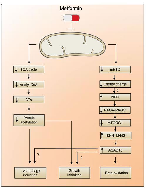 According to a prior report, the transcription factor Skn-1/Nrf-2, which regulates the transcription of antioxidants/cytoprotective genes and is repressed by mTORC1, is indispensable for the metformin-mediated increase in lifespan observed in C. elegans.[9] Soukas’ group now provides evidence that ACAD10 expression triggered by metformin was partially reduced upon Skn-1 silencing, explaining a possible role of this factor in the pro-health effects of metformin. [4]