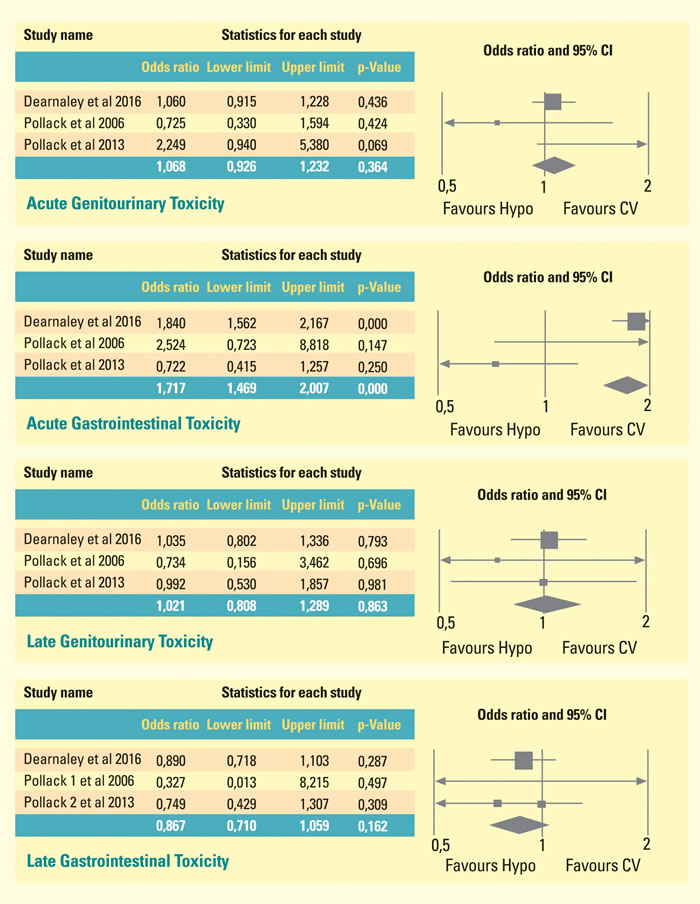 Pollack et al, in the first study reported a greater toxicity in the hypofractionated treatment group (70.2Gy in 26 fz vs 76Gy in 38fz) only for acute gastrointestinal (18% vs 8%), instead G2 recorded in the lower genitourinary acute toxicity (48% vs 56%), in the late genitourinary (6% vs 8%), and in late gastrointestinal (0% vs 2%). In the second study, Pollack et al, showed increased toxicity genitourinary acute and late in hypofractionated scheme (70.2 Gy in 26 fz vs 76 Gy in 38 fz), lower the gastrointestinal. The meta-analysis showed an advantage in terms of acute gastrointestinal and late genitourinary toxicity for Hypofractionated schemes.