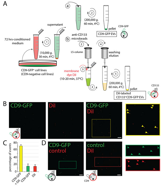 Figure 1: Production, Isolation and Labeling of EVs. A. Isolation scheme of CD9-GFP+, CD133+CD9-GFP+ and CD133+CD9- EVs derived from transfected or infected cells. EVs containing CD9-GFP (or those derived from cells infected with shCD9 lentivirus, not depicted) were enriched from 72 h-conditioned media by differential centrifugation alone (a) or in combination with immunomagnetic isolation using anti-human CD133 microbeads (b). In both cases, conditioned media were first centrifuged at 10,000 x g for 30 min (step 1). Total CD9-GFP+ EVs were then recovered upon ultracentrifugation of 10,000 g-supernatant (a, 2) or CD133+CD9-GFP+ EVs were immune-isolated (b, 2), labeled with membrane dye DiI (3), washed/eluted (4) and recovered by ultracentrifugation (5). The illustrated EVs indicated their CD9-GFP (green) and/or membrane (red) labeling. B., C. FEMX-I cell-derived DiI-labeled CD133+CD9-GFP+ EVs were adhered to coverslip and observed by CLSM (B). The area indicated with a yellow square is displayed at higher magnification. Arrowheads indicate double fluorescent EVs. Percentages of double-labeled EVs (CD9-GFP + DiI) or single-labeled EVs (CD9-GFP or DiI) within our preparations are presented (C, n = 3 independent experiments). Note that not all CD9-GFP+ EVs are labeled with DiI or expressed CD9-GFP. D. As controls, CD9-GFP+ EVs (left panel) or native EVs labeled with DiI (right panel) were observed by CLSM. The areas indicated with squares are displayed at higher magnification. Note the absence of autofluorescence of EVs in both conditions (arrowheads). Scale bar, 5 µm.