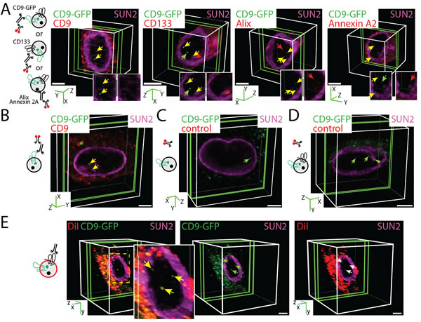 Figure 2: CD9-GFP+ EV-derived Biomaterials Localized in the Nuclear Compartment of Recipient Cells. A., B. FEMX-I cells (A) and MSCs (B) were incubated (4.5 h) with 5 x 107 EVs/ml derived from CD9-GFP-transfected FEMX-I or infected MSCs, respectively, prior to their immunolabeling with SUN2 Ab (purple, all cases) and CD9, CD133, Alix and Annexin A2 Abs (red) as indicated. Cells were analyzed by CLSM and 3D reconstructions of 1-3 sections (0.4-µm each for FEMX-I cells or 0.2-µm for MSCs, green slice) of one cell are shown. In insets, relevant areas of the nucleus are displayed in individual single channels. (A). CD9-GFP or specific antigen signals and those co-labeled are indicated (green, red and yellow arrows, respectively). The cartoons illustrate the EVs with the pertinent labeling. Note the absence of CD133 in MSC-derived EVs. C., D. As negative control, only secondary Ab was employed on MSCs (C) and FEMX-I cells (D). The green arrowhead indicates the presence of CD9-GFP in nuclear envelope invagination (D). E. FEMX-I cells were incubated with DiI-labeled CD133+CD9-GFP+ EVs (5 x 107 particles/ml) prior to CLSM. Arrow indicates the double-labeled EV-derived biomaterials in the nucleus. Scale bars, 5 µm.
