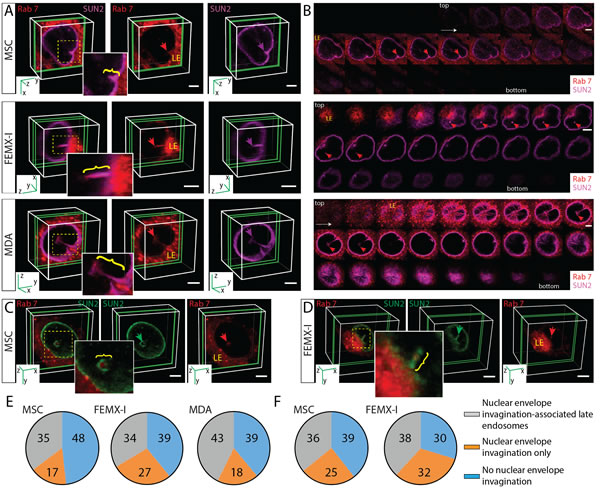 Figure 4: Subdomains of Late Endosomes Invading Nuclear Envelope Invaginations. A., B. MSCs, FEMX-I and MDA cells expressing Rab7-RFP were immunolabeled with SUN2 Ab and analyzed by CLSM. 3D reconstructions of 1-3 sections (green slice) of one cell are shown, and relevant areas (yellow squares) covering nuclear envelope invaginations (purple arrow) with Rab7+ late endosomes (red arrow) are enlarged (A). The late endosome subdomains invading nuclear envelope invagination are indicated (bracket). Relevant individual x-y sections of the images presented in panel A are displayed (B). The image of FEMX-I cells is also presented in Supplementary Video 3. C., D. MSCs or FEMX-I cells were double-labeled with SUN2 and Rab7 Abs and analyzed by CLSM. The late endosome subdomains (Rab7, red arrow) invading nuclear envelope invagination (SUN2, green arrow) are indicated (bracket). E., F. Percentages of cells with SUN2-stained nuclear envelope invaginations containing Rab7 (observed either upon its expression as Rab7-RFP fusion protein (E) or immunostaining (F)), or not are indicated in pie charts (>50 cells were evaluated per experiment, n = 3; extended data are presented in Supplementary Table 1). Scale bars, 5 µm.