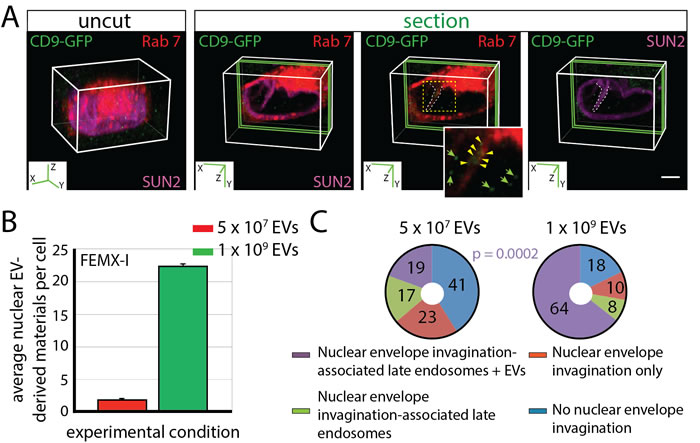 Figure 5: Dose-dependent Localization of CD9-GFP+EV-derived Biomaterials in N-ALE and Nuclear Compartment of Recipient Cells. A.-C. FEMX-I cells expressing Rab7-RFP were incubated (4.5 h) with 5 x 107 or 1 x 109 EVs/ml derived from CD9-GFP-transfected FEMX-I cells prior their immunostaining for SUN2, and analyzed by CLSM. 3D reconstructions of 40 x-y sections (0.4-µm each; uncut) or 2 sections (green slice) of cells incubated with 1 x 109 EVs/ml are displayed. The relevant area (dashed square) covering a nuclear envelope invagination (dashed line) with Rab7+ late endosomes containing CD9-GFP (arrowheads) is enlarged. CD9-GFP found in the nucleus are indicated (arrows). The average of CD9-GFP in the nucleus of a given cell is indicated (B, error bars, s.e.m., >50 cells were evaluated per experiment, n = 3). Percentages of cells without or with SUN2-stained nuclear envelope invaginations containing or not Rab7-RFP (late endosomes) as well as CD9-GFP (EV-derived biomaterials) upon their exposure to EVs are indicated in pie charts (C, extended data are presented in Supplementary Table 1). The P value of the number of cells with N-ALE containing CD9-GFP (N-ALE + EVs) upon exposure to 5 x 107 vs. 1 x 109 CD9-GFP+ EVs/ml is indicated. Scale bar, 5 µm.