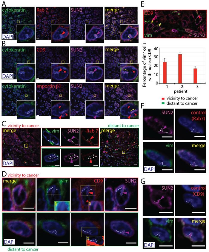 Figure 7: Presence of N-ALE in Breast Cancer Patient Biopsies. A.-E. Biopsies from patients 1 (A, B, E), 2 (E), and 3 (C, D, E) were immunolabeled either for pan-cytokeratin (CK) or vimentin (vim) in combination with Rab7, CD9, importin β1 or SUN2 followed by the appropriate secondary Abs. Samples were counterstained with 4’,6-diamidino-2-phenylindole (DAPI) and analyzed by CLSM. An overview (0.25-µm section) of tissues is presented and relevant areas (squares) covering N-ALE (brackets and/or dashed lines) with Rab7 (A, C), CD9 or importin β1 (B, D) signals are enlarged. To detect a potential weak staining of vim or CD9 in N-ALE, the non-modified exposure of the immunofluorescence was manually increased using Photoshop software (D, insets with zigzag arrows). Note the absence of CK and vim in N-ALE as well as CD9 in those found in stromal cells distant from tumor microenvironment (TME). Quantification of CD9 in vim+ cell nuclei (E). The nuclear CD9 immunoreactivities in vim+ cells in vicinity or distant regions of TME were evaluated by analyzing 41-45 x-y sections (0.25-µm each) covering the entire nucleus (>100 cells from three patients were evaluated). Yellow arrow shows vim+ cell without CD9 in their nucleus. F., G. As negative controls, primary Ab against Rab7 (F) or CD9 (G) was omitted. In all panels, colored arrowhead indicates the presence of the corresponding immunofluorescent signal in N-ALE, while red arrow shows the nuclear CD9 staining. Scale bars, 15 (overview panels, A-C), 3 (C, D, F, G) µm.