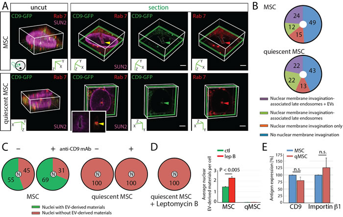 Figure 8: Lack of EV-derived Biomaterials in Nuclei of Quiescent MSCs. A.-D. Proliferating and quiescent MSCs expressing Rab7-RFP were incubated (4.5 h) with FEMX-I-derived CD9-GFP+ EVs (5 x 107 particles/ml) in the absence (A-C) or presence (C) of anti-CD9 mAb (25 µg/ml) prior the immunostaining for SUN2. Cells were analyzed by CLSM. Alternatively, leptomycin B (lep B, 10 ng/ml) was added after the initial 2.5 h-incubation with EVs (D). Arrowheads indicate CD9-GFP (green) and Rab7 (red) in nuclear envelope invagination (dashed lines, yellow) (A). Percentages of cells without or with SUN2-labeled nuclear envelope invagination containing or not Rab7-RFP (late endosomes) and CD9-GFP (+ EV) are indicated in pie charts (B, n = 3, extended data are presented in Supplementary Table 1). Percentages of cells with or without CD9-GFP in their nucleus (N) are indicated (C, D, extended data are presented in Supplementary Table 1) while bar graph shows the average number of nuclear CD9-GFP per cell in the presence or absence of leptomycin B (D). E. The expression of CD9 and importin β1 in proliferating (MSC) and quiescent (qMSC) MSCs were quantified by immunoblotting and normalized to GAPDH as internal loading control. Antigen expression was arbitrarily set at 100% for proliferating MSCs. N.s., not significant. Scale bars, 5 µm.