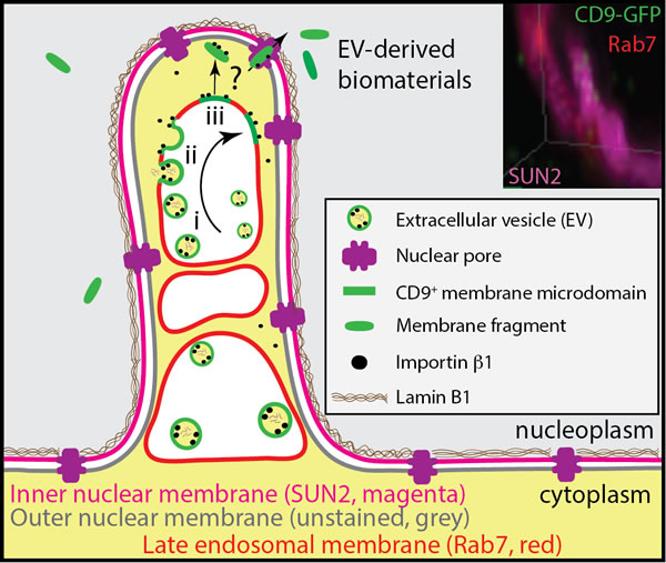 Here, we present evidence that subdomains of the Rab7+ late endosomes come together with nuclear envelope invaginations to form a new sub-nuclear compartment where biomaterials from EVs are delivered. Therein, EV-derived biomaterials are transferred to the nucleus where they modify the gene expression profile of the host cells. In cancer cell niches, this trafficking mechanism could be particularly important because of the growing evidence that cancer cells hijack the surrounding tissue microenvironment to promote their own growth and spreading [7].