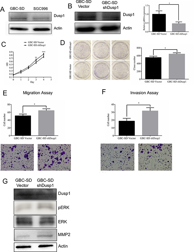 Figure 4: Knocking down DUSP1 in gallbladder cancer cell lines GBC-SD. Expression level of DUSP1 was higher in GBC-SD cell (A). Knocking down Dusp1 in GBC-SD cell (western blot and Q-PCR) (B). Proliferation was evaluated by MTT assay (C), clone formation assay and relative efficiency of 3 experiments (D). Representative images and quantitatively analysis of migrated GBC-SD cells knocking down DUSP1 versus vector control (E). Representative images and quantitatively analysis of invaded GBC-SD cells knocking down DUSP1 or vector control (F). Western blot analysis results show lower expression of DUSP1 and higher expression of pERK and MMP2 in the GBC-SD DUSP1 knocking down cells (G). (*P < 0.05, **P < 0.01, ***P < 0.001, ****P < 0.0001).