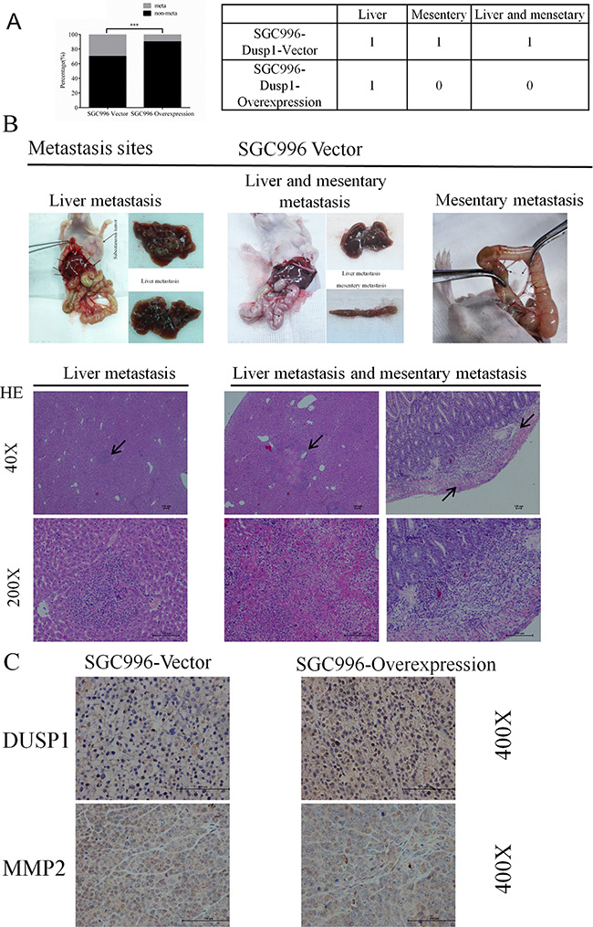 To verify the ability of DUSP1 to inhibit metastasis in vivo, we applied the same xenograft model, subcutaneously transplanting SGC996-vector (n = 10) or SGC996-oe (n = 10) cells into nude mice. Six weeks later, we sacrificed the mice and examined them for metastasis. Significantly more mice receiving SGC996-vector cells exhibited metastases than did those receiving SGC996-oe cells (3/10 vs 1/10, P < 0.001) (Figure 6A). Metastasis was detected in the liver, mesentery or both in the SGC996-vector group (Figure 6B, marked by arrows). Hematoxylin & eosin staining confirmed the metastatic tumors in mice in the SGC996-oe group originated from the implanted SGC996 cells. Immunohistochemical analysis also revealed stronger MMP2 expression in the SGC996-vector group (Figure 6C).