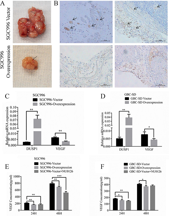 Figure 7: Images of tumor vessels (A) from SGC996-DUSP1 stable cells versus vector control in mice model. IHC of CD31 for endothelial cells (B) was stained. VEGF relative mRNA (C, D) and VEGF concentrations using ELISA detection (E, F) were evaluated representively in SGC996 and GBC-SD stable cells. (*P < 0.05, **P < 0.01, ***P < 0.001, ****P < 0.0001).