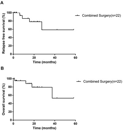 Figure 1: Kaplan-Meier survival curves for relapse-free survival A. and overall survival B. according to patients in our study who underwent simultaneous esophagectomy and coronary artery bypass grafting.