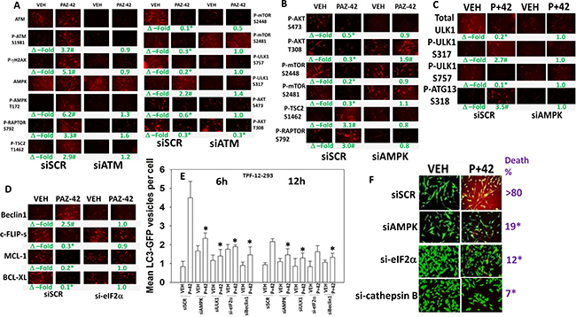 Figure 5: ATM-AMPK signaling and ER stress signaling are required for [pazopanib + AR42] to kill. (A) TPF-12-293 cells were transfected to knock down the expression of ATM. Twenty-four h after transfection cells were treated with drugs for 6 h. Immuno-fluorescence was performed. (n = 3 +/– SEM) #p < 0.05 greater than corresponding vehicle control; *p < 0.05 less that corresponding vehicle control. (B) and (C) TPF-12-293 cells were transfected to knock down the expression of AMPKα. Twenty-four h after transfection cells were treated with drugs for 6 h. Immuno-fluorescence was performed. #p < 0.05 greater than corresponding vehicle control; *p < 0.05 less that corresponding vehicle control. (D) TPF-12-293 cells were transfected to knock down the expression of eIF2α. Twenty-four h after transfection cells were treated with drugs for 6 h. Immuno-fluorescence was performed. #p < 0.05 greater than corresponding vehicle control; *p < 0.05 less that corresponding vehicle control. (E) TPF-12-293 cells were transfected with a plasmid to express LC3-GFP and in parallel transfected to knock down expression of AMPKα, ULK1, eIF2α or Beclin1. Twenty-four h after transfection cells were treated with drugs for 6 h or 12 h as indicated. (n = 3 +/– SEM). *p < 0.05 less that corresponding value in siSCR cells. (F) TPF-12-293 cells were transfected to knock down the expression of AMPKα, cathepsin B or eIF2α. Twenty-four h after transfection cells were treated with drugs for 24 h to determine viability. (n = 3 +/– SEM). *p < 0.05 less than corresponding value in siSCR cells.