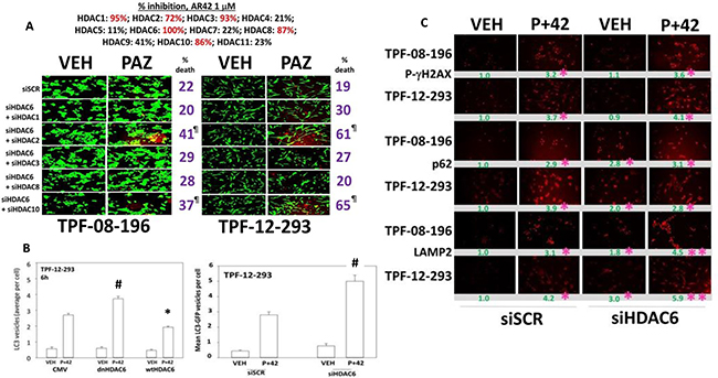 Figure 7: HDAC6 regulates autophagosome formation. (A) Upper: The percentage catalytic inhibition of each HDAC by AR42 at a concentration of 1 μM; Lower: Melanoma cells were transfected to knock down the expression of HDAC6, combined with molecules to knock down the expression of HDAC1 or HDAC2 or HDAC3 or HDAC8 or HDAC10. Twenty-four h after transfection the cells were treated with pazopanib to determine viability (n = 3 +/– SEM). ¶p < 0.001 greater than corresponding values in siSCR; [siHDAC6 + siHDAC1]; [siHDAC6 + siHDAC3]; [siHDAC6 + siHDAC8] cells. (B) Melanoma cells were transfected with: left graph: an empty vector plasmid, a plasmid to express wild type HDAC6 or a plasmid to express dominant negative HDAC6; right graph: to knock down expression of HDAC6. In parallel all cells were transfected with a plasmid to express LC3-GFP. Twenty-four h after transfection cells were treated with drugs for 6 h. The numbers of punctate LC3-GFP staining vesicles were counted (n = 3 +/– SEM) #p < 0.05 greater than corresponding value in siSCR/CMV cells; *p < 0.05 less than corresponding value in siSCR/CMV cells. (C) Melanoma cells were transfected to knock down expression of HDAC6. Twenty-four h after transfection cells were treated with drugs for 6 h. Staining was performed to determine the levels of P-γH2AX; p62/SQSMT1; LAMP2. (n = 3 +/– SEM) *p < 0.05 greater than vehicle control in siSCR cells; **p < 0.05 greater than corresponding value in siSCR cells.