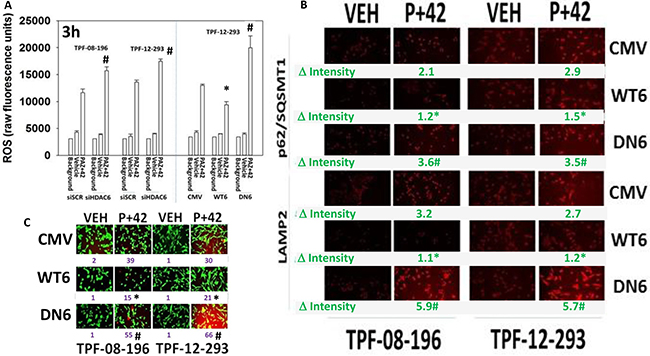 Dysregulation of HDAC6 has also been linked to elevated production of reactive oxygen species and our prior data had shown the drug combination reduced TRX and SOD2 levels. Knock down of HDAC6 enhanced the abilities of our drug combination treatment to increase ROS levels (Figure 9A). Over-expression of TRX or SOD2 protected cells from drug combination lethality (data not shown). Over-expression of HDAC6 reduced the ability of [pazopanib + AR42] to increase ROS levels. Expression of dominant negative HDAC6 enhanced the ability of [pazopanib + AR42] to increase ROS levels. Knock down of HDAC6 was previously shown to enhance the ability of [pazopanib + AR42] to increase LAMP2 levels, and similarly, expression of dominant negative HDAC6 enhanced drug-induced LAMP2 levels (Figure 9B). Expression of wild type HDAC6 lowered the basal levels of LAMP2 and significantly reduced the accumulation of LAMP2 after drug exposure. Similar confirmatory data were also obtained when we examined changes in p62/SQSMT1 expression. The alterations observed in autophagosome formation were also reflected in the ability of [pazopanib + AR42] to kill the melanoma cells, with expression of wild type HDAC6 reducing killing and expression of dominant negative HDAC6 promoting death (Figure 9C).