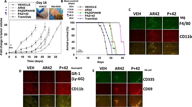 Figure 10: [Pazopanib + AR42] suppresses melanoma tumor growth in vivo. (A) Tumor volumes were measured at the start of treatment (Day 0) and on the indicated days (n = 10, +/– SEM). *p < 0.05 less than Trametinib/Dabrafenib treated tumors; ¶p < 0.05 less than AR42 alone or pazopanib alone treated tumors. (B) Animals were sacrificed when the tumor volume reached 250 mm3. Survival data are plotted as a Kaplan Meier survival curve. *p < 0.05 greater survival compared to vehicle control; ¶p < 0.05 greater survival compared to AR42 alone. (C–E) Four micron slides of vehicle treated; AR42 treated; and [pazopanib + AR42] tumors were made and immunohistochemistry performed to determine the expression and co-localization of: C. F4/80 and CD11b (macrophages); D. GR-1 and CD11b. Note that GR-1 staining used a conjugated antibody that was detected in the Far Red range. The hue of the image was converted to green to permit co-localization analyses with CD11b (neutrophil); E. CD335 and CD69 (natural killer cell).