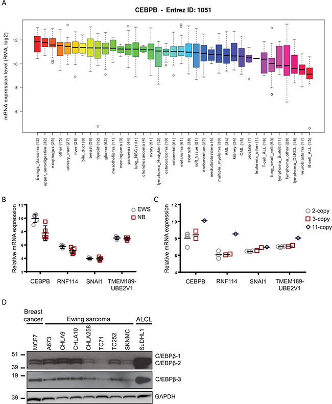 Figure 1: CEBPB expression in Ewing sarcoma. (A) CEBPB expression was interrogated in cancer cell lines from the Cancer Cell Line Encyclopedia (Broad Institute). Ewing sarcoma cell lines had the highest CEBPB mRNA expression on average compared to any other cancer type. (B) Data from the GEO dataset GSE1825 was analyzed to determine relative mRNA expression of the genes within the region of high copy number gain on chromosome 20q in Ewing sarcoma patient samples compared to neuroblastoma patient samples (CEBPB: P = 0.016). (C) Relative mRNA expression of 4 genes within the region of gain on chromosome 20q with normal or increased copy number in Ewing sarcoma patient samples. (D) Expression of the C/EBPβ protein isoforms in Ewing sarcoma cell lines by Western blot. MCF7 (breast cancer) and SuDHL1 (anaplastic large cell lymphoma) were included as positive controls, and GAPDH serves as a loading control.