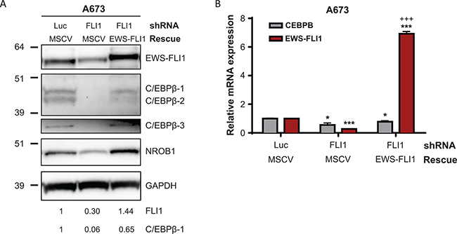 Figure 2: C/EBPβ expression in Ewing sarcoma cells is regulated by EWS-FLI1. (A) EWS-FLI1 was knocked down with FLI1 shRNA and rescued in A673 cells. Luc is a non-targeting shRNA control and MSCV is an empty vector control. Expression of EWS-FLI1 and C/EBPβ protein isoforms was analyzed by Western blot, with GAPDH as a loading control. FLI1 and C/EBPβ bands were quantified by densitometry. (B) EWS-FLI1 was knocked down and rescued in A673 cells. Relative EWS-FLI1 and CEBPB transcript levels were measured by qRT-PCR. Multiple t tests were applied to determine statistical significance. (P-value for experimental vs control: *P < 0.05, **P < 0.005, ***P < 0.0001; P-value for experimental vs knockdown: +P < 0.05, ++P < 0.005, +++P < 0.0001.).