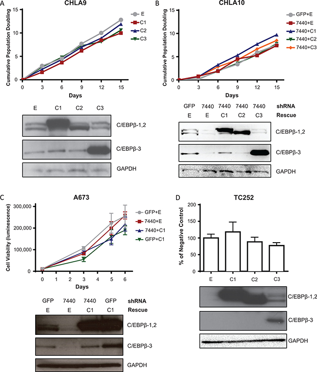 Figure 3: C/EBPβ isoform expression does not affect cell proliferation or viability in 2D culture. (A) C/EBPβ isoforms were overexpressed in CHLA9 cells. Population doubling time was calculated by the 3T5 assay. (B) CEBPB was knocked down, then each isoform was rescued in CHLA10 cells. Population doubling time was calculated by the 3T5 assay. (C) CEBPB was knocked down then C/EBPβ-1 was rescued in A673 cells. Cell viability was measured over time with Cell Titer Glo (Promega) with raw luminescence values representing cell viability. (D) CEBPB isoforms were overexpressed in TC252 cells. Cell viability was measured 72 hours after cells were plated. Multiple t tests demonstrate no statistical difference between treatments and control. Western blots in all panels show C/EBPβ isoform expression, with GAPDH included as a protein loading control. E = empty vector (control); C1 = C/EBPβ-1; C2 = C/EBPβ-2; C3 = C/EBPβ-3.