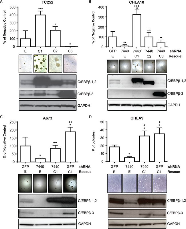 Figure 4: C/EBPβ-1 promotes attachment-independent cellular transformation. (A) C/EBPβ isoforms were overexpressed in TC252 cells and grown in soft agar. Colonies were imaged and cell viability was measured after 14 days. (B) C/EBPβ was depleted, then each isoform was rescued in CHLA10 cells. Cells were grown in soft agar and colonies were imaged and cell viability measured after 16 days. (C) C/EBPβ was depleted and C/EBPβ-1 was rescued or overexpressed in A673 cells. Cells were grown in soft agar and colonies were imaged and cell viability was measured after 14 days. (D) C/EBPβ was depleted and C/EBPβ-1 was rescued or overexpressed in CHLA9 cells. Cells were grown in soft agar and colonies were imaged and counted after 27 days. Protein expression of each of the three overexpressed, knocked down, or rescued isoforms in each panel is shown. GAPDH is included as a loading control. Multiple t tests were performed to determine statistical difference between treatments and control in each experiment. (P-value for experimental vs control: *P < 0.05, **P < 0.005, ***P < 0.0001; P-value for experimental vs knockdown: +P < 0.05, ++P < 0.005, +++P < 0.0001). E = empty vector (control); C1 = C/EBPβ-1; C2 = C/EBPβ-2; C3 = C/EBPβ-3.
