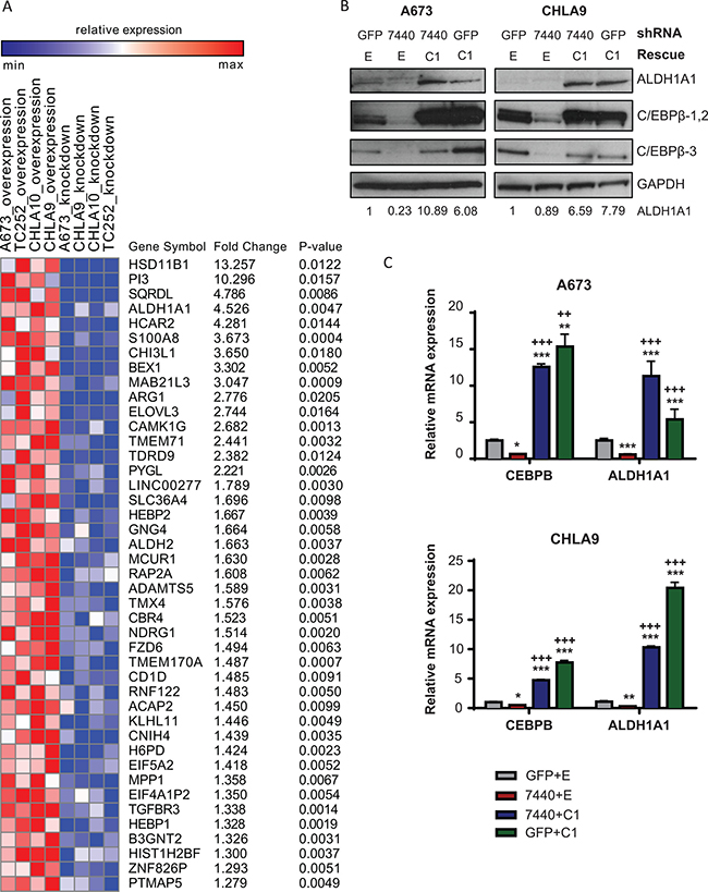 Figure 5: ALDH1A1 is a target of C/EBPβ-1. (A) Heat map of differentially expressed genes between C/EBPβ-1 knockdown and C/EBPβ-1 overexpression normalized to control in four Ewing sarcoma cell lines. Gene list was ranked by average fold-change between C/EBPβ-1 knockdown and overexpressed samples normalized to control sample in each cell line. Top 43 genes (fold change > 1.25; permutation test P < 0.05) that positively correlated to C/EBPβ-1 expression are shown on the list. P-values by t-test for all genes included on the heat map are listed. (B) ALDH1A1 protein expression was analyzed by Western blot in A673 and CHLA9 cells with C/EBPβ knockdown, rescue, and overexpression. ALDH1A1 bands were quantified by densitometry. (C) Relative expression of CEBPB and ALDH1A1 mRNA in the same cells as in B. Expression was normalized to endogenous GAPDH. Multiple t tests were performed to determine statistical significance among treatments. (P-value for experimental vs control: *P < 0.05, **P < 0.005, ***P < 0.0001; P-value for experimental vs knockdown: +P < 0.05, ++P < 0.005, +++P < 0.0001). E = empty vector (control); C1 = C/EBPβ-1; C2= C/EBPβ-2; C3= C/EBPβ-3.