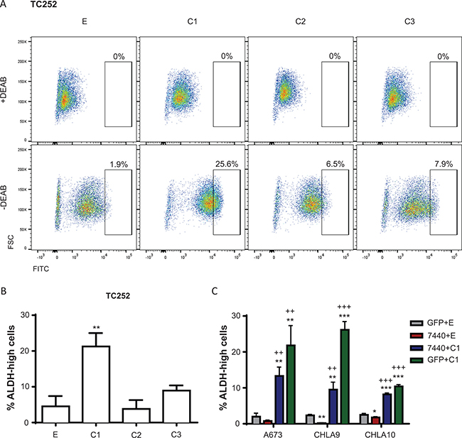 Figure 6: ALDH activity is influenced by C/EBPβ expression. (A) Representative FACS analysis of TC252 cells subject to the Aldefluor Assay. Percentage of viable cells that are gated as ALDH-high (FITC positivity) is shown. (B) Percentage of live TC252 cells from A that are gated as ALDH-high with overexpression of each C/EBPβ isoform. (C) C/EBPβ was depleted, rescued, and overexpressed in A673, CHLA9, and CHLA10 cells, and cells were subject to the Aldefluor Assay. Percentage of live cells that are gated as ALDH-high in each condition is shown. Multiple t tests were used to determine statistical significance. (P-value for experimental vs control: *P < 0.05, **P < 0.005, ***P < 0.0001; P-value for experimental vs knockdown: +P < 0.05, ++P < 0.005, +++P < 0.0001). E = empty vector (control); C1 = C/EBPβ-1; C2 = C/EBPβ-2; C3 = C/EBPβ-3.