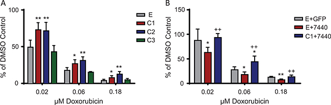 Ewing sarcoma cells transduced with CEBPB isoforms were seeded at 1000 cells/well in black clear-bottom 96-well tissue culture plates. 24 hours following seeding, doxorubicin was added at the indicated concentrations. DMSO was used as a no-treatment control (doxorubicin stock was dissolved in DMSO). Cell viability was measured with Cell Titer Glo (Promega) 48 hours following drug treatment.