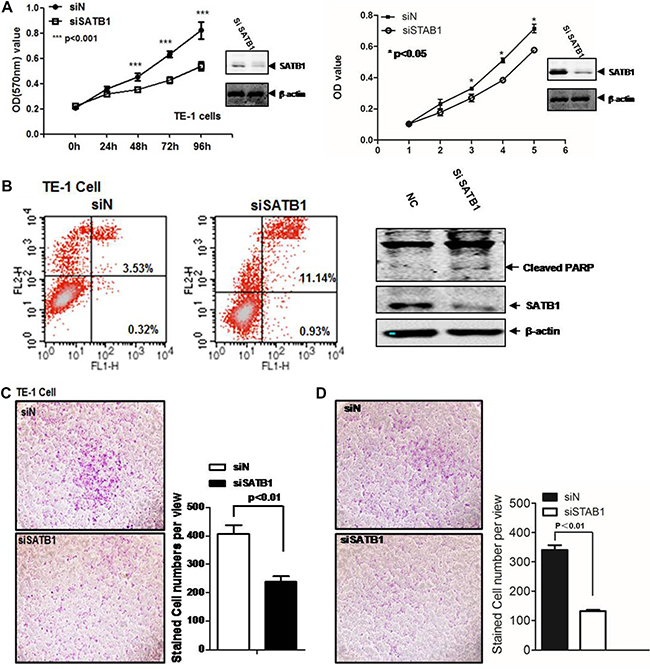 Figure 1: SATB1 promotes TE-1 and EC-109 cell survival and migration. (A) MTT is employed to measure the cell viability in TE-1 and EC-109 cells. siN is the siRNA pool for control and siSATB1 is siRNA pool for SATB1; (B) Flow cytometry was performed to analyze the cell apoptosis. FL1-H is annexin V and FL2-H is PI. Western blot was performed to detect the cleaved PARP. Cell invasion/migration was evaluated by Transwell assays for (C) TE-1 cells and (D) EC-109 cells. The results are the mean ± SEM of three independent experiments.