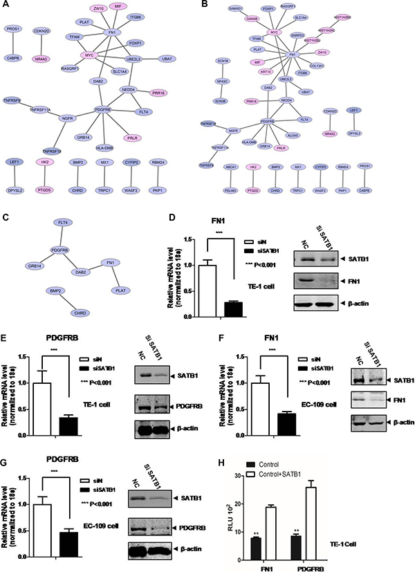 Construction of biological networks analysis showed FN1 and PDGFRB were hub genes regulated by SATB1 in TE-1 cells