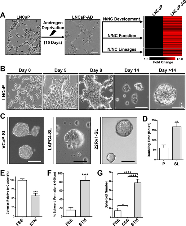 Figure 1: Developmental reprogramming of PCa Cells to a stem-like intermediate. (A) Chronic AD of LNCaP cells upregulated genes associated with N/NC stem cells and derivative tissues. LNCaP cells (Left) cultured in androgen-depleted medium for 15-days undergo a morphological transformation (Middle), and overexpress genes associated with N/NC stem cells and derivative tissues shown on heat-mapping (Right). (B) Representative phase-contrast images of LNCaP cells over two weeks of culture in STM. (C) Representative phase-contrast images of VCaP, LAPC4 or 22Rv1 spheroids after 14-day STM-mediated reprogramming. Scale bars represent 100 μm. (D) Proliferation assays of parental LNCaP (P) and reprogrammed stem-like LNCaP cells (SL) showed that the doubling time of LNCaP-SL is significantly greater than parentals. Mean ± standard error; **P < 0.01. (E) Clone formation of dispersed LNCaP cells grown in FBS or STM medium indicates that reprogramming occurs in at least 57% of LNCaP cells plated. Mean ± standard deviation; ***P < 0.001. (F) The percentage of spheroids (diameters greater than 100 μm) is significantly greater in STM cultured LNCaP cells compared to FBS cultured LNCaP cells, over 14 days. Mean ± standard deviation shown; ****P < 0.0001. (G) Spheroid colony formation assay of LNCaP cells cultured in FBS, CSS or STM on attachment-free plates shows advantage of STM compared to standard culture medium (RPMI) with (FBS) or without androgen (CSS). Mean ± standard deviation; ***P < 0.001; ****P < 0.0001.