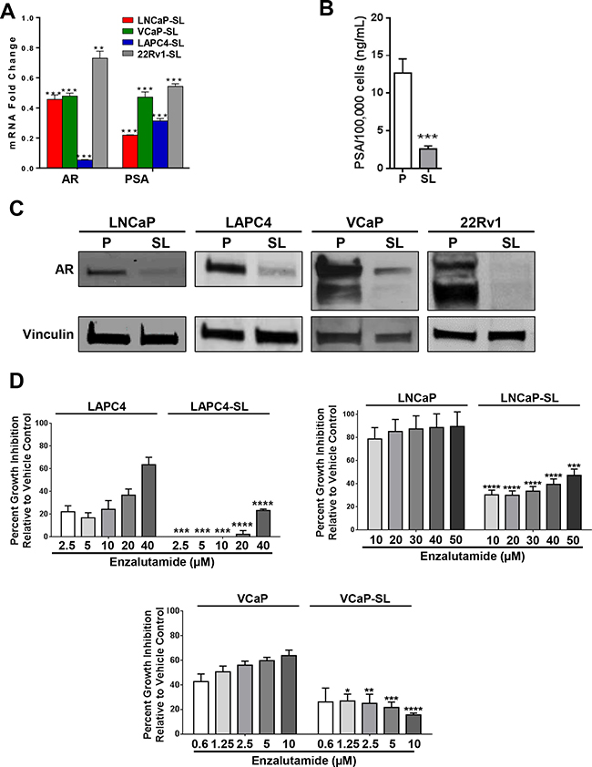 Figure 2: Androgen Receptor axis down-regulation in developmentally reprogrammed PCa cells. (A) AR and PSA mRNA expression, measured by RT-qPCR, is down-regulated in reprogrammed (SL) PCa cells compared to parentals. Bars represent relative expressions compared to parental cell lines. Mean ± standard error; **P < 0.01; ***P < 0.001. (B) Secretion of PSA into cell medium was significantly downregulated in LNCaP-SL cells over 48 hours compared to parental cells. Mean ± standard deviation; ***P < 0.001. (C) Western Blot analyses of parental and reprogrammed PCa cells showed down-regulation of AR and AR-variant protein. (D) Relative growth inhibition (7-days) of LAPC4, LNCaP and VCaP parental and stem-like cells with increasing dosages of enzalutamide. Mean ± standard deviation; *P < 0.05; **P < 0.01; ***P < 0.001; ****P < 0.0001.