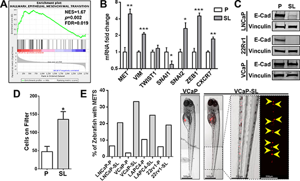 Figure 6: Reprogrammed PCa cells possess increased invasive/metastatic abilities. (A) GSEA indicates a significant enrichment of EMT genes in LNCaP-SL cells. (B) qPCR analyses show that reprogrammed LNCaP-SL cells overexpress mRNA of key EMT markers. Mean ± standard error; *P < 0.05; **P < 0.01; ***P < 0.001. (C) Western Blot demonstrates loss of E-Cadherin in reprogrammed PCa cells indicating increased EMT phenotype. (D) Reprogrammed LNCaP-SL cells demonstrate increased invasion through a Matrigel-coated membrane in in vitro invasion assays compared to parental LNCaP cells. Mean ± standard error; *P < 0.05. (E) Reprogrammed stem-like PCa cells are more invasive/metastatic in zebrafish assays (Left). Representative photomicrographs of VCaP and VCaP-SL xenografted fish illustrates dispersal of fluorescently-labelled VCaP-SL cells within the caudal region (Right).