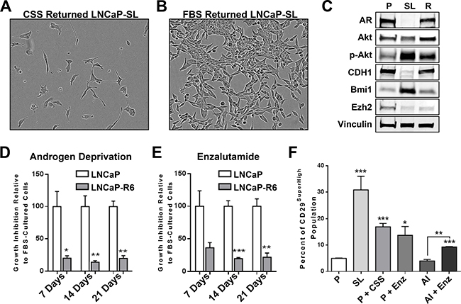 Figure 7: Reprogramming in vitro by androgen-deprivation and acquired therapy resistance. (A) LNCaP-SL cells re-differentiate to neuroendocrine-like cells within 5-days in RPMI with CSS. (B) LNCaP-SL cells regain the typical morphology of LNCaP cells within 5-days in RPMI with FBS. Scale bars represents 100 μm. (C) Western Blot shows that re-differentiated LNCaP cells regain AR and E-Cadherin expression while retaining higher phosphorylated-AKT and BMI1 protein expression. (D) Loss of growth inhibition when LNCaP-R6 cells were grown in RPMI with CSS medium compared to parental LNCaP demonstrates acquired resistance to androgen-deprivation. (E) Loss of growth inhibition of LNCaP-R6 cells grown in RPMI with FBS supplemented with 1 μM enzalutamide compared to parental cells demonstrates acquired resistance to enzalutamide. Mean ± standard error; *P < 0.05; **P < 0.01; ***P < 0.001. (F) FACS analyses shows the increase of CD29SuperHigh populations in reprogrammed LNCaP cells and in parental LNCaP cultured in RPMI with CSS (P+CSS) or RPMI with FBS and 10 μM enzalutamide (P+Enz) for 3 days, LNCaP androgen-independent cells (AI) cultured in CSS (AI) or in the presence of 10 μM enzalutamide (AI+Enz). Mean ± standard error; *P < 0.05; **P < 0.01; ***P < 0.001.