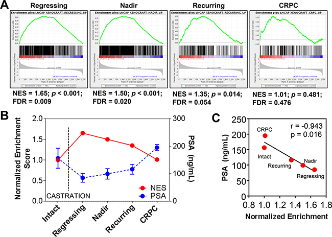 Gene Set Enrichment Analysis (GSEA) showed that genes overexpressed in reprogrammed LNCaPs (p < 0.05, fc > 1.5) were positively enriched in the transcriptomes of LNCaP xenografts following castration of the host mouse (Figure 8A, 8B). Normalized enrichment scores (NES) reach highest significance in regressing and PSA-nadir tumors. Afterwards, NES diminished again to non-significance as tumors relapsed to castration-resistance. Moreover, we observed a reverse correlation of NES with serum PSAs in the xenografts (Figure 8C), suggesting that residual tumor cells at PSA nadir that will repopulate the recurrent tumor are enriched for an mRNA expression profile associated with the in vitro reprogramming of tumor cells.