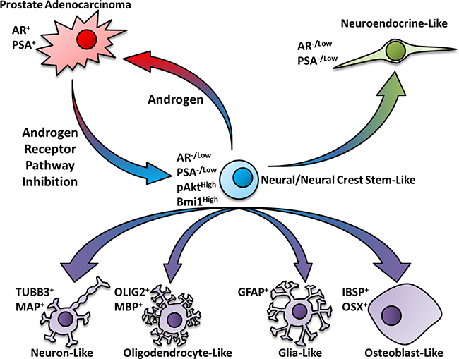 Figure 10: Schematic pathway for the neural/neural crest stem cell-mediated transdifferentiation of prostate cancer cells. Based on the outcomes of this study, we propose a model whereby androgen receptor pathway inhibition triggers a developmental reprogramming process that results in a metastable cancer stem-like state that resembles neural/neural crest stem cells. These N/NC stem-like cells may acquire features of differentiated N/NC derived cell lineages when placed into cell-specific differentiation mediums. Depending on the cellular microenvironment, these developmentally reprogrammed cells may transdifferentiate to neuroendocrine-like or other therapy resistant PCa cell types.