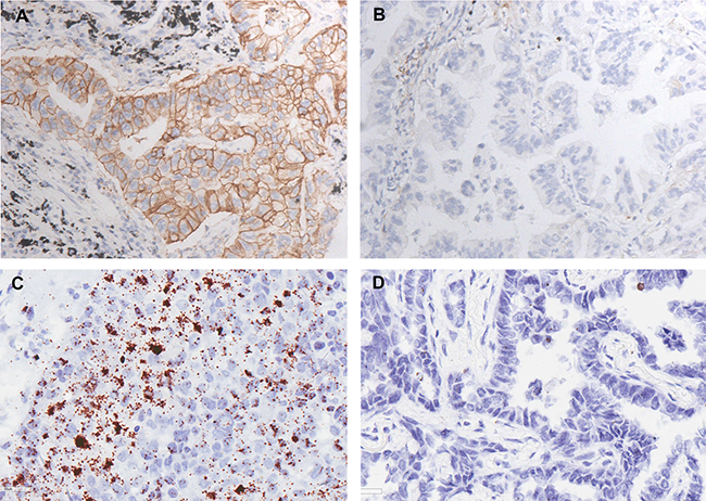 Figure 1: Representative results of PD-L1 expression in lung adenocarcinoma. (A) Positive result of PD-L1 examined via immunohistochemistry method. (×40) (B) Negative result of PD-L1 examined via immunohistochemistry method. (×40). (C) Positive result of PD-L1 examined via RNA in situ hybridization method. (×40). (D) Negative result of PD-L1 examined via RNA in situ hybridization method. (×40)