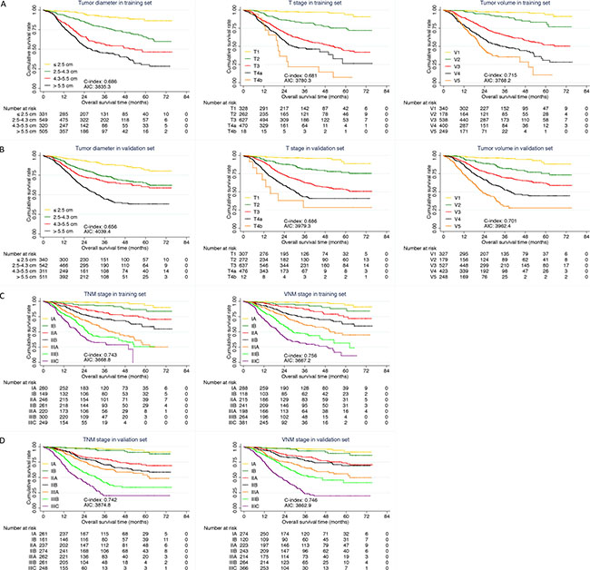 In current study, we calculated the tumor volume based on the formula V = Tumor diameter × T stage2/2. The mathematic model of tumor volume referred to the formula V = length × width2/2 in the tumor bearing mouse model [34]. We used tumor diameter instead of the length and replaced the width with T stage. We first used the C-index and AIC value to evaluate the predictive accuracy and prognostic discriminatory ability for tumor volume, respectively. The predictive value of V stage was higher than tumor diameter and T stage. However, accurate prediction of prognosis is more determined by the staging system than a variable alone [12]. We then conducted the VNM stage on the basis of the two most powerful prognostic predictors—V stage and N stage. The predictive accuracy and prognostic discriminatory ability of VNM stage was better than those of TNM stage.
