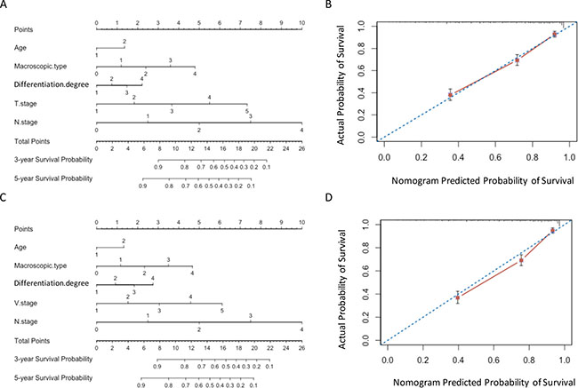 Further, two nomograms were developed for predicting the overall survival. The VNM model had significant advantages in the predictive accuracy and prognostic discriminatory ability than TNM model. The predicted survival of VNM model showed well agreement with the actual survival.