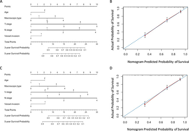 Figure 4: Nomograms in validation set. (A) and (B) Nomogram plots and calibration curves of TNM stage; (C) and (D) Nomogram plots and calibration curves of VNM stage.