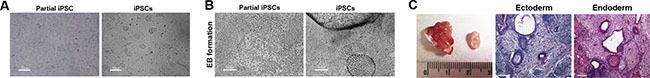 Figure 1: In vitro and in vivo differentiation potential of partially reprogrammed cells. (A) Partial iPSCs formed flat colonies, whereas fully reprogrammed iPSCs formed dome-like colonies on feeder cell-layered dishes; scale bar = 100 μm. (B) Partial iPSCs did not form embryoid bodies (EB) using the in vitro differentiation protocol. In contrast, fully reprogrammed iPSCs successfully formed EBs; scale bar = 100 μm. (C) The in vivo differentiation potential of partial iPSCs determined by teratoma formation. Partial iPSCs formed teratomas, but mesodermal tissue was rarely detected. Teratoma tissue sections contained ectodermal and endodermal tissues; scale bar = 100 μm.