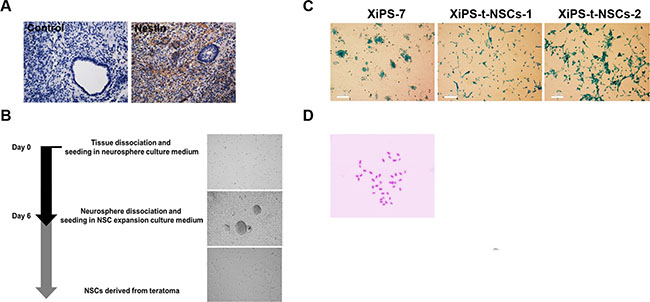 Figure 2: Successful generation of in vivo NSCs from teratomas derived from partially reprogrammed cells. (A) Expression of Nestin in partial iPSC-derived teratoma sections; original magnification 100×. (B) Timeline of protocol for purification of NSCs from teratoma tissues. (C) Partial iPSCs and their teratoma-derived NSCs (XiPS-t-NSCs) were stained with X-gal, which indicated that there was no contamination by host cells; scale bar = 100 μm. (D) Karyotype analysis of XiPS-tNSCs. Forty diploid chromosomes were observed; DNA was stained with Giemsa.