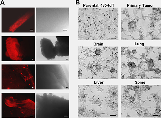 Figure 1: Use of fluorescent microscopy to assess the locations of metastatic lesions in ex vivo organ samples and the growth patterns of the subsequent pure metastatic cell lines. (A) Fluorescence and corresponding phase-contrast images of brain, liver, lung, and spine tissue explants immediately after dissection. (B) Phase contrast images of the different colony growth patterns of pure brain, liver, lung, and spine metastatic sublines as well as the primary tumor cell line, compared to the monolayer growth pattern of parental 435-tdT cells. Microscopy was on a Nikon eclipse TS100 inverted microscope using in (A) a 10× objective for brain and spine or 4x objective for liver and lung images, while all images in (B) were obtained using a 10× objective. Microphotographs were acquired using a Roper Scientific CoolSnap™ ES camera, images were captured with NIS-Elements F3.2 software, and processed with ImageJ. Scale bars in all images depict 100 μm.