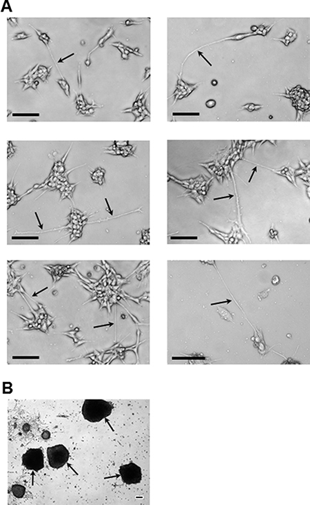 Figure 3: Representative images of the brain cell line colony and mammosphere growth patterns. (A) Images highlighting (arrows) the very long (> 100 μm: see scale bars) nanotube interconnections (or filopodia; e.g., middle right-hand image) that consistently form during: 24 hr (top row), 48 hr (middle row), and 120 hr (bottom row) of growth. (B) Examples, under adherent culture conditions, of the large free-floating mammospheres (arrows) that consistently formed during subculturing of smaller floating mammospheres retrieved from confluent brain cell line culture medium. All imaging equipment and image processing was the same as described in Figure 1. All images in (A) were obtained with a 10x objective. The image in (B) was obtained using a 4x objective. Scale bars in all images depict 100 μm.