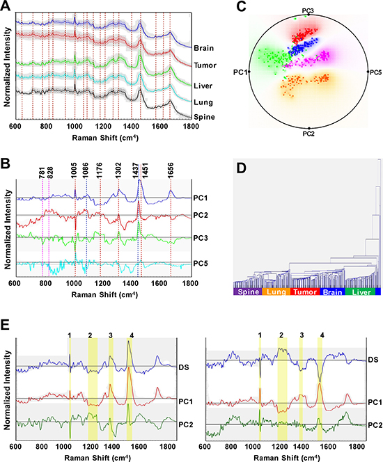 Starting from an orthotopic xenograft based mouse model system, the studied human cell lines were obtained from cultured organ-of-origin explants of: brain, liver, lung, and spine, as well as from the primary, i.e., mammary fat pad (MFP), site. These metastatic sites are representative of the common clinically observed breast cancer metastatic destinations [25, 26] with spine representative of bone. Despite being isogenic, these cell lines exhibit important morphological and growth distinctions that support our hypothesis that each metastatic site imbues metastatic tumors with unique molecular attributes. Our Raman spectroscopic measurements reveal the presence of consistent spectral differences of the cell lines. Using multivariate chemometric methods, we show that these spectral changes can be utilized to develop decision algorithms with high diagnostic power. Furthermore, we identify the presence of spectrally informative features that bring to light each cell line’s unique spectral characteristics, which reflect the inherent biochemical distinctions. We reason that these differences are a result of intricate reciprocal interactions between the cancer cells, parenchyma, and stroma at the target organ during metastatic growth. Combined with the ability to assay the stromal features, our findings underscore the relevance of Raman spectral information in characterizing isogenic metastatic lesions at different sites in terms of inherent biochemical determinants without staining or requiring a priori knowledge of the molecular transformations. In addition, preliminary metabolomic analyses provide supporting data indicating that cancer cells from different metastatic sites acquire metabolic changes, which may define a cell line’s metastatic organ of origin. Notably, a complementary overlap between the metabolite distinction data set and Raman spectroscopic signatures was also found.